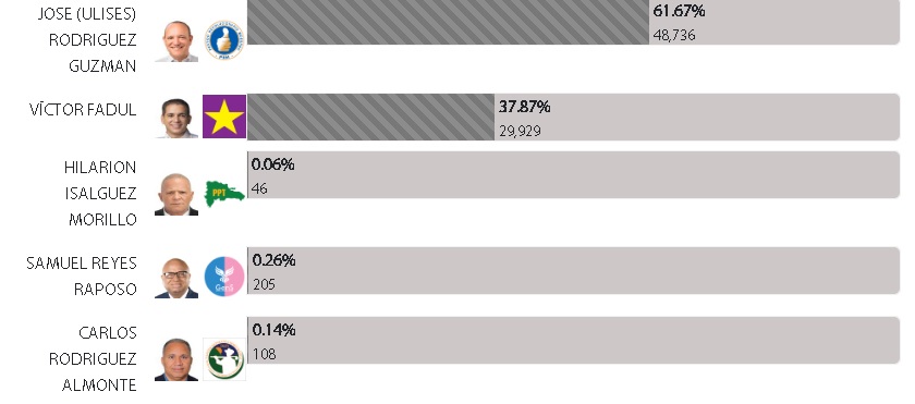 Según el primer boletín de resultados de la JCE, Rodríguez Guzmán tenía 61.67% de los votos depositados, seguido por Víctor Fadul, del opositor Partido de la Liberación Dominicana, con 37.87%.