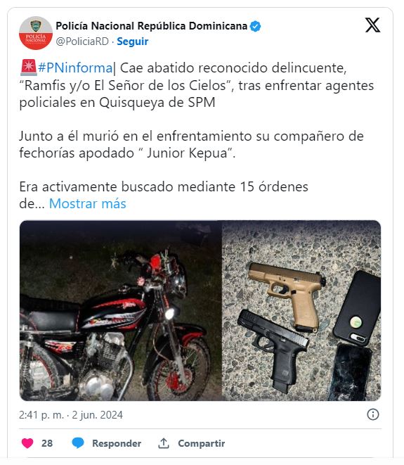 Se trata de Ramfis Theophile (alias El Señor de los Cielos), de 32 años; y Junior Ramírez (alias Junior Kepua), quienes murieron «mientras recibían atenciones médicas en un centro de salud» de la citada provincia, según un comunicado de la institución del orden.