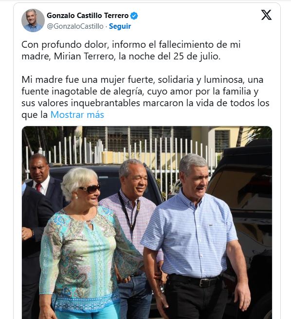 “Con profundo dolor, informo el fallecimiento de mi madre, Miriam Terrero, la noche del 25 de julio”, informó Castillo este sábado, a través de su cuenta oficial de X.