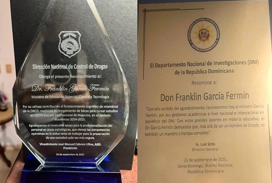 El Departamento Nacional de Investigaciones (DNI) y la Dirección Nacional de Control de Drogas (DNCD) otorgaron reconocimientos al ministro de Educación Superior, Ciencia y Tecnología, doctor Franklin García Fermín, durante un acto académico.