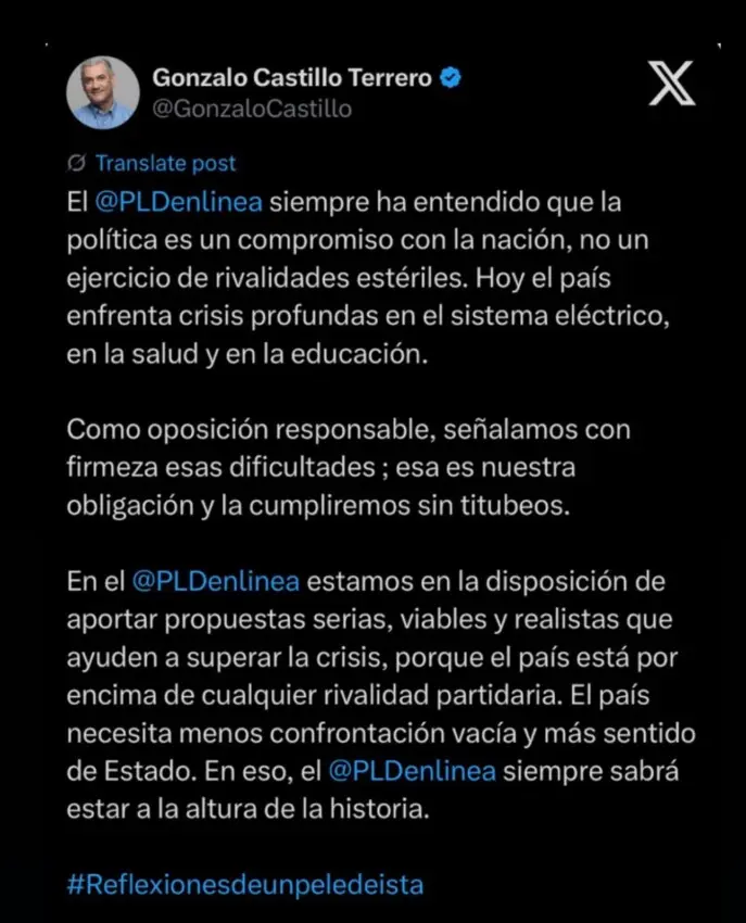 La declaración fue compartida en sus redes sociales bajo la etiqueta #Reflexionesdeunpeledeísta, reafirmando que el PLD se mantendrá como una oposición firme, crítica y propositiva frente a los retos actuales del país.
