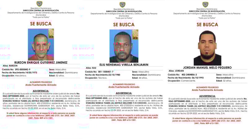 La Policía informó que busca a tres hombres señalados como responsables del ataque a tiros contra una persona que se trasladaba en una jeepeta por la avenida Núñez de Cáceres, en el Distrito Nacional, en un hecho ocurrido el día 22 de septiembre de este año.