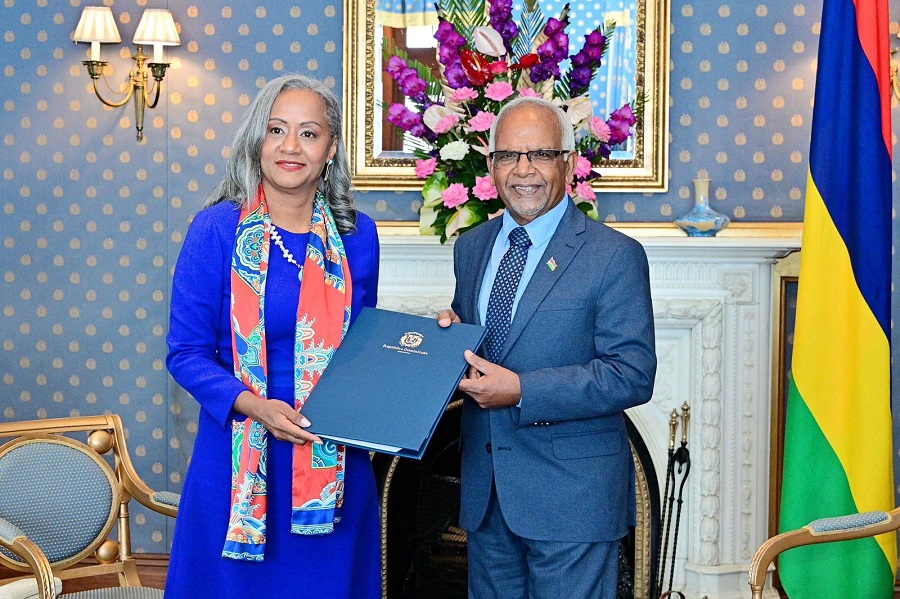 Port Louis, Mauricio.— La Embajadora Erika Álvarez Rodríguez presentó, en una ceremonia oficial celebrada en la Casa de Gobierno, las Cartas Credenciales que la acreditan como Embajadora Extraordinaria y Plenipotenciaria de la República Dominicana ante la República de Mauricio, con sede en Pretoria, ante S.E. el Sr. Dharambeer Gokhool, Presidente de la República de Mauricio, convirtiéndose en la primera mujer dominicana acreditada en ese país.