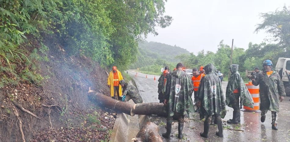 En este caso, voluntarios de la Defensa Civil, tanto de Barahona como de la zona afectada, laboran para despejar las vías y restablecer la circulación.