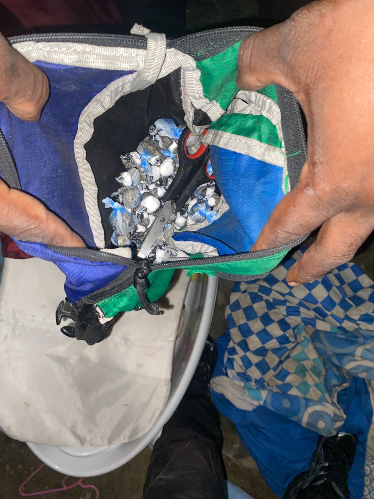 Durante el registro, los investigadores ocuparon 29 porciones de un vegetal verde, presumiblemente marihuana (30.1 gramos) y 104 porciones de un polvo blanco, presumiblemente cocaína (128.4 gramos).