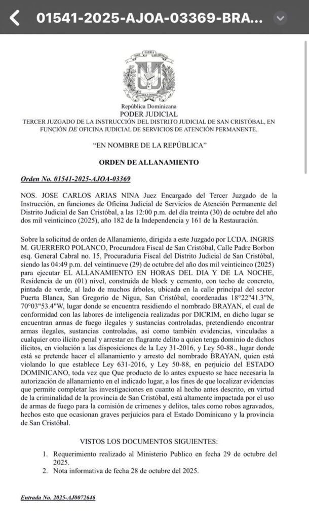 La Subdirección Regional de Investigaciones (DICRIM) San Cristóbal, a través de su Sección de Investigaciones Nigua, realizó un exitoso allanamiento en virtud de la orden judicial No. 01541-2025-AJ0A-03369, en una vivienda ubicada en la calle principal del sector Boca de Nigua, municipio San Gregorio de Nigua, provincia San Cristóbal.