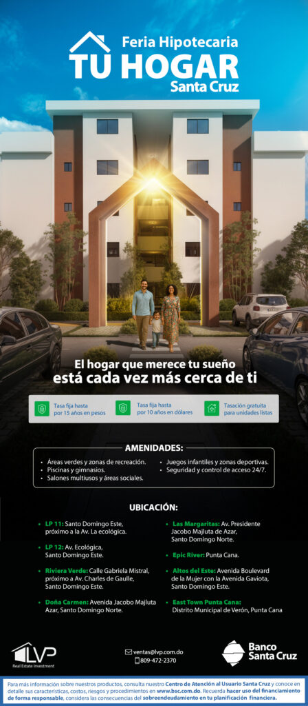 El Banco Santa Cruz, en alianza estratégica con LVP, anuncia el lanzamiento de su esperada “Feria Hipotecaria Tu Hogar Santa Cruz & LVP”, diseñada para hacer realidad el sueño de la vivienda propia para miles de familias dominicanas.
