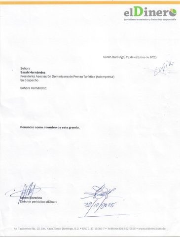 De acuerdo con Severino, la carta está fechada el 29 de octubre, pero con acuse de recibo el día 30 del mismo mes. Hernández recibió la comunicación durante una visita a elDinero para procurar una firma de quien fuera, hasta ese momento, el director de Relaciones Institucionales de la entidad que agrupa a los periodistas, comunicadores y generadores de contenido turístico de República Dominicana.