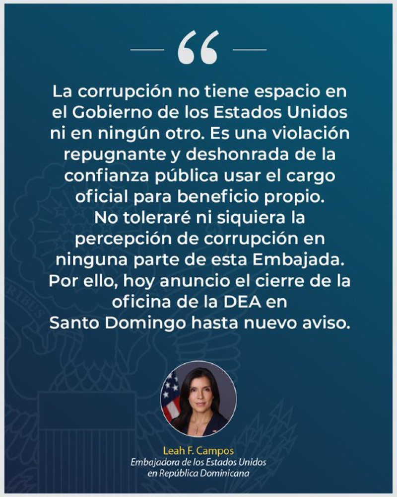 Por ello, hoy anuncio el cierre de la oficina de la DEA en Santo Domingo hasta nuevo aviso”, comunicó Campos.