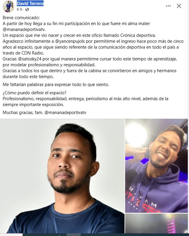 El destacado cronista deportivo David Terrero anunció este viernes el cierre de un ciclo importante en su carrera profesional, al informar su salida del programa “Mañana Deportiva”, espacio que se transmite de lunes a viernes a través de CDN Radio.