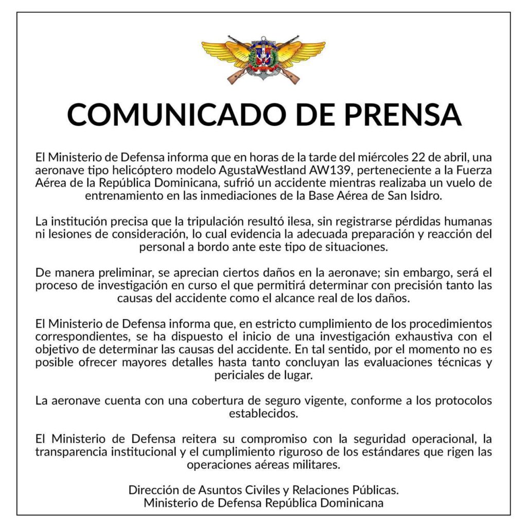 El Ministerio de Defensa informa que en horas de la tarde del miércoles 22 de abril, una aeronave tipo helicóptero modelo AgustaWestland AW139, perteneciente a la Fuerza Aérea de la República Dominicana, sufrió un accidente mientras realizaba un vuelo de entrenamiento en las inmediaciones de la Base Aérea de San Isidro.
